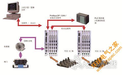 來自博世力士樂的MAC-8(圖2),是針對特別復雜的應用而推出的創新型開放式高端運動控制裝置,可根據客戶對液壓傳動的具體要求進行定制。 MAC-8可控制多達32個液壓系統和實時并聯的電子NC軸。控制裝置依照模塊化原則構建,通過ProfibusDP或以太網與更高級別的控制裝置進行通信,并經由CANbus與現場級進行通信。對于可視化系統的接口,博世力士樂采用了OPC服務器和ActiveX中的標準化PC 技術。 在軟件中,博世力士樂考慮了液壓傳動技術的獨有特征,因此便于將具有現場總線功能的液壓裝置集成到高級控制結構中。